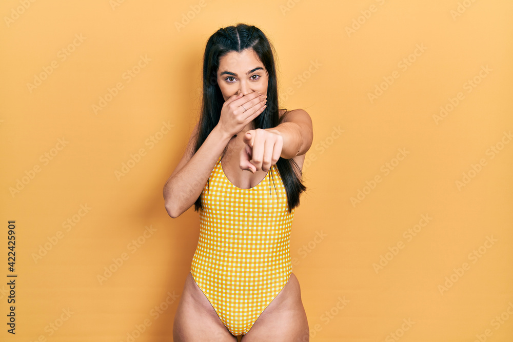 Young hispanic girl wearing swimsuit laughing at you, pointing finger to the camera with hand over mouth, shame expression