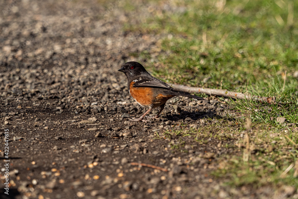 one small cute towhee bird snipping the seeds left on the walking path in the park on a sunny day
