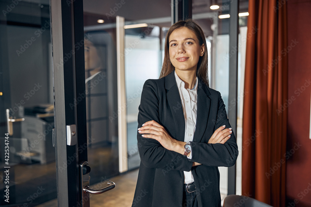 Pleased businesswoman in business attire looking ahead
