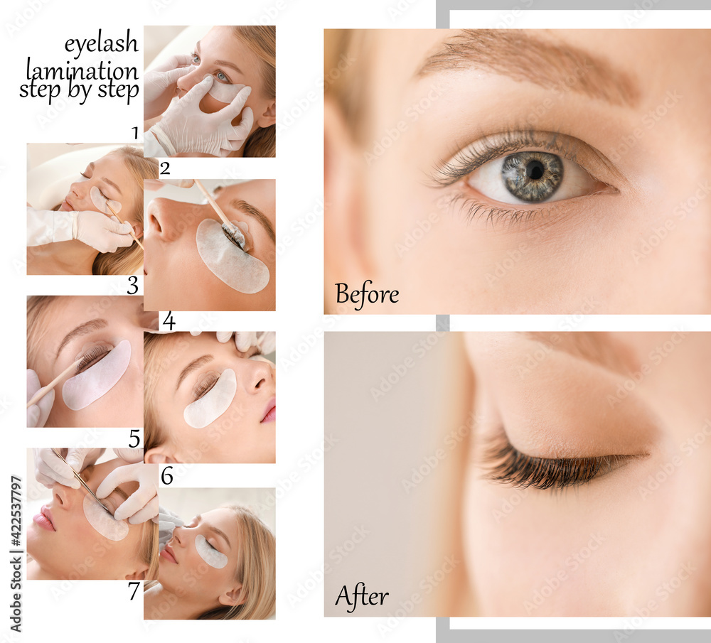 Collage of beautiful young woman undergoing procedure of eyelashes lamination in beauty salon