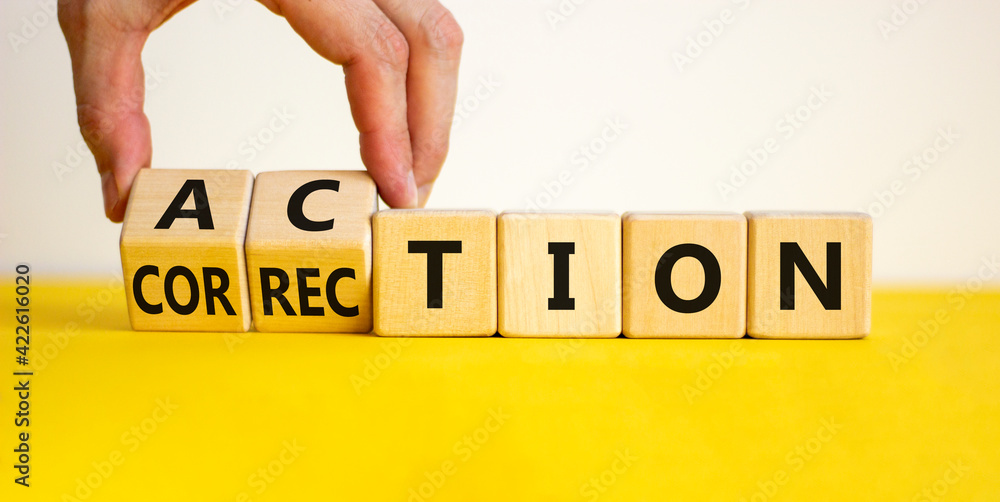 Action or correction symbol. Businessman turns wooden cubes and changes the word correction to action. Beautiful yellow table, white background, copy space. Business and action or correction concept.