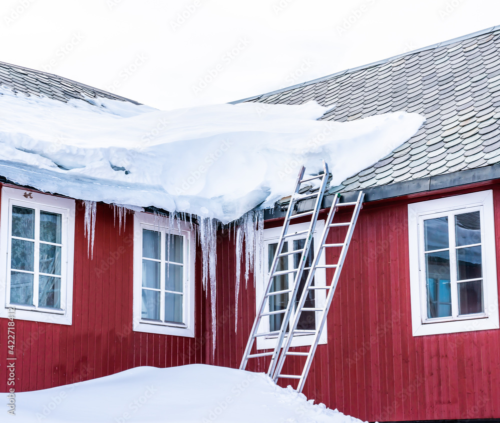 Long and massive icicles hanging from the roof of an old building.