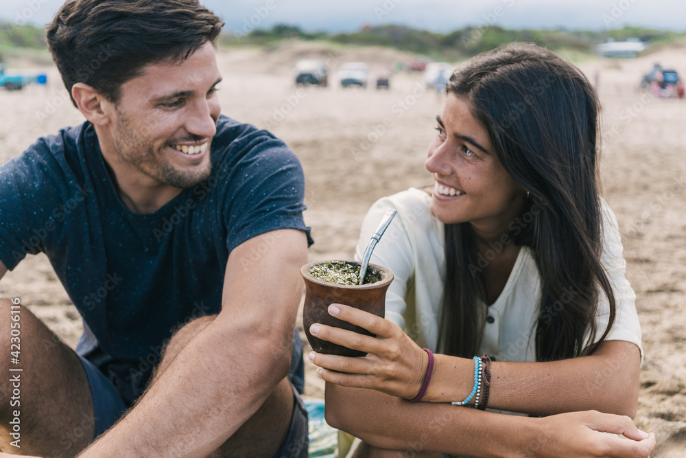 Happy young couple sharing yerba mate herbal tea at the beach.