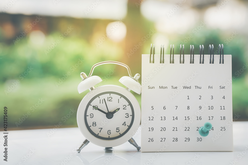 white calendar with green thumbtacks marked the last day of month and white alarm clock on white table with blurred outdoor background
