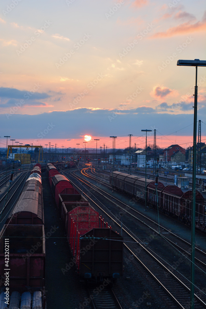 Zwei Güterzüge stehen im Güterbahnhof im Hauptbahnhof in Schweinfurt, mit Sonnenuntergang am Himmel, Franken, Bayern, Deutschland