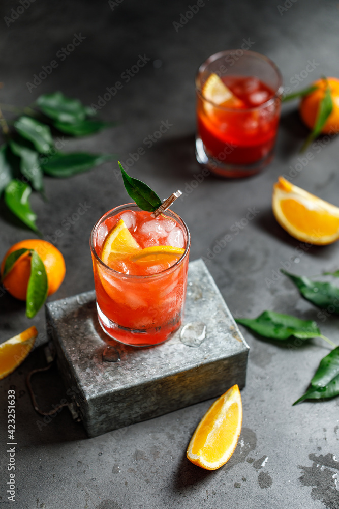 A glass of orange cocktail with ice cubes. Summer refreshing cocktail