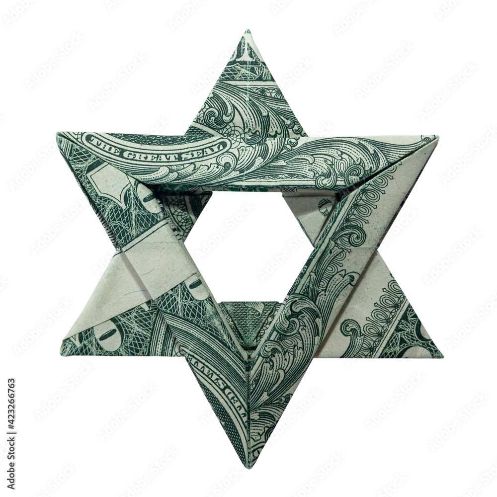 Money Origami Jewish STAR of DAVID Folded with Real One Dollar Bill Isolated on White Background
