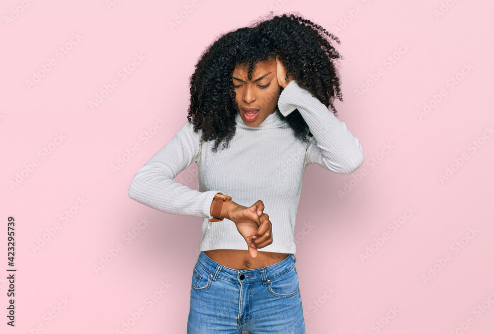 Young african american girl wearing casual clothes looking at the watch time worried, afraid of getting late