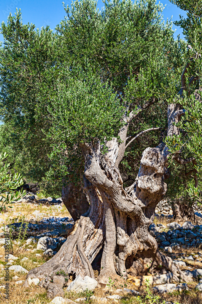 An old olive tree grows on the coast of the island of Pag in the Olive Gardens of Lun, Croatia.