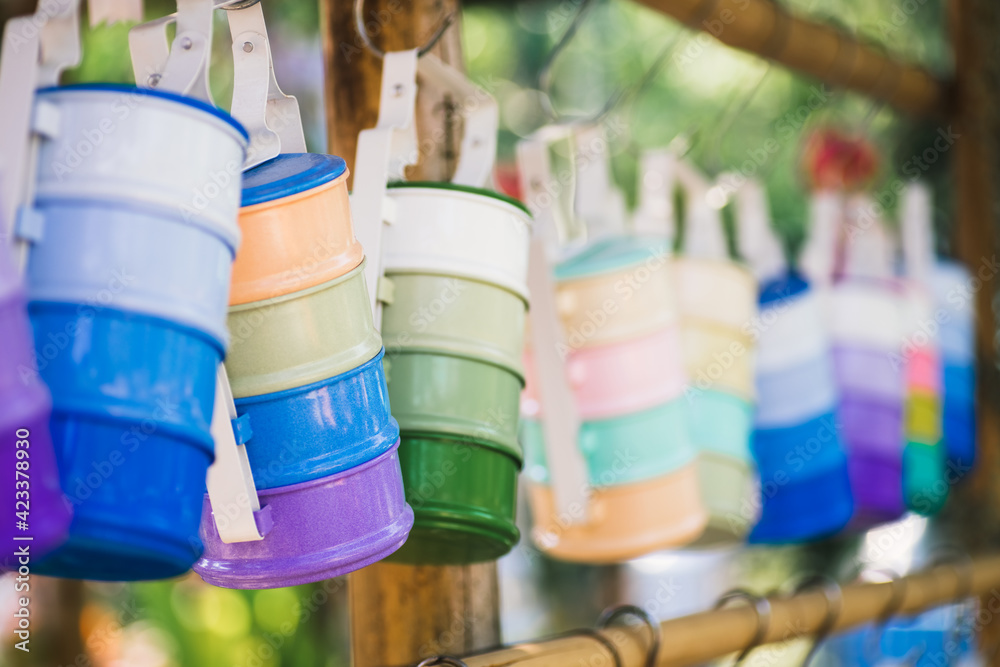 Still life with multicolored food carrier or tiffin carrier hanging on the wood stick. Selective focus vintage retro Thai style colorful tiffin carrier for background. Shallow DoF.