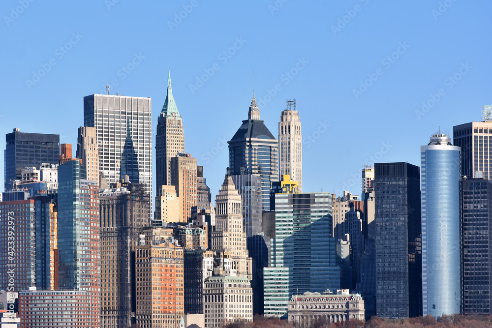 Buildings architecture of Manhattan, New York City seen from Ellis Island, New Jersey, USA.