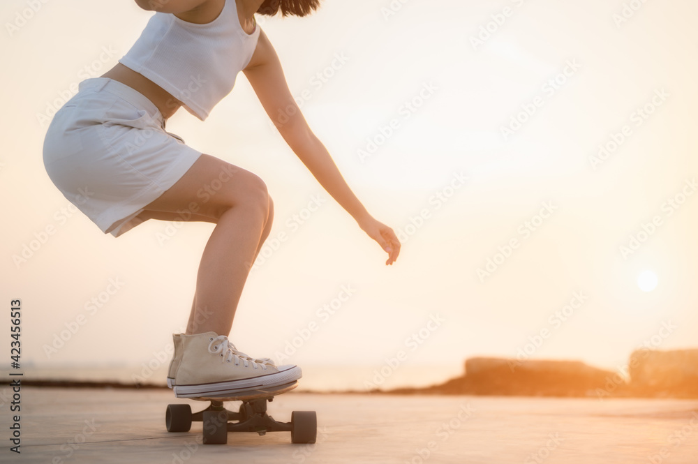 Close-up Asian Beautiful women surf skate or skateboard outdoors on beautiful summer day. Happy young women play surf skate at park near the beach on morning time. Sport activity lifestyle concept.