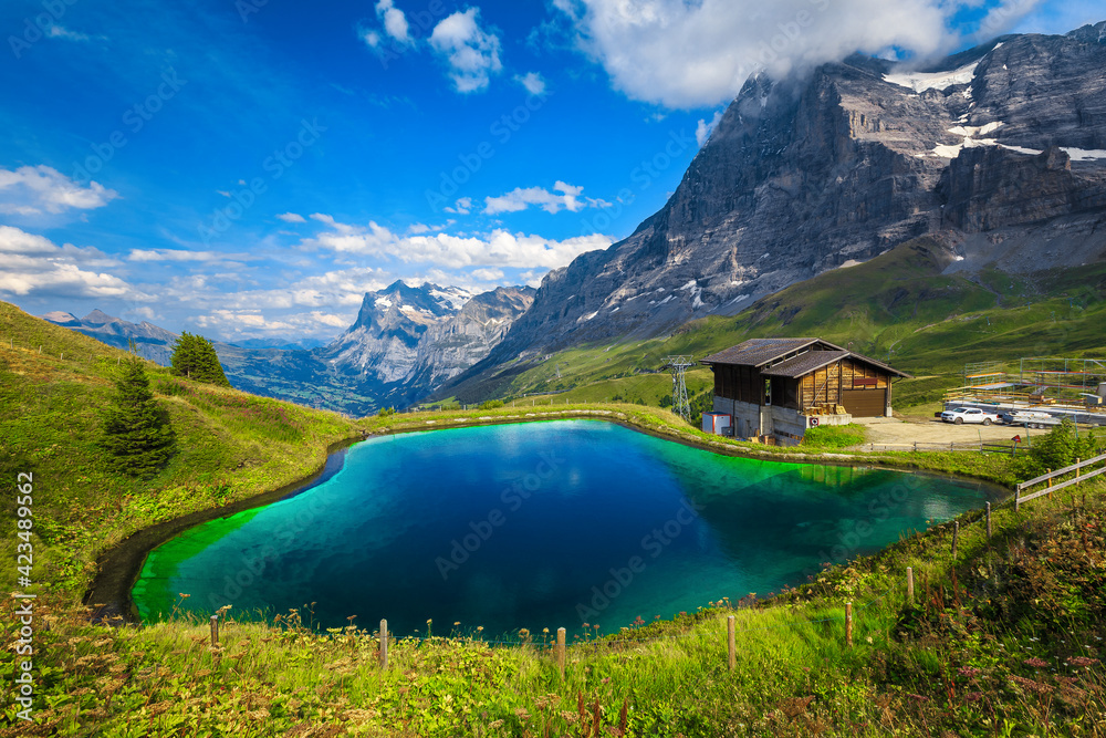 Alpine turquoise lake and Eiger mountain in background, Switzerland
