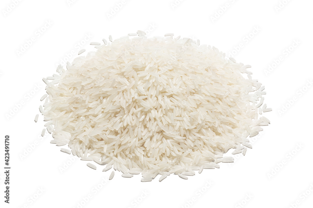 Pile of white rice. Macro of natural rice realistic closeup photo image. Close up of long rice grains can use for background and texture.