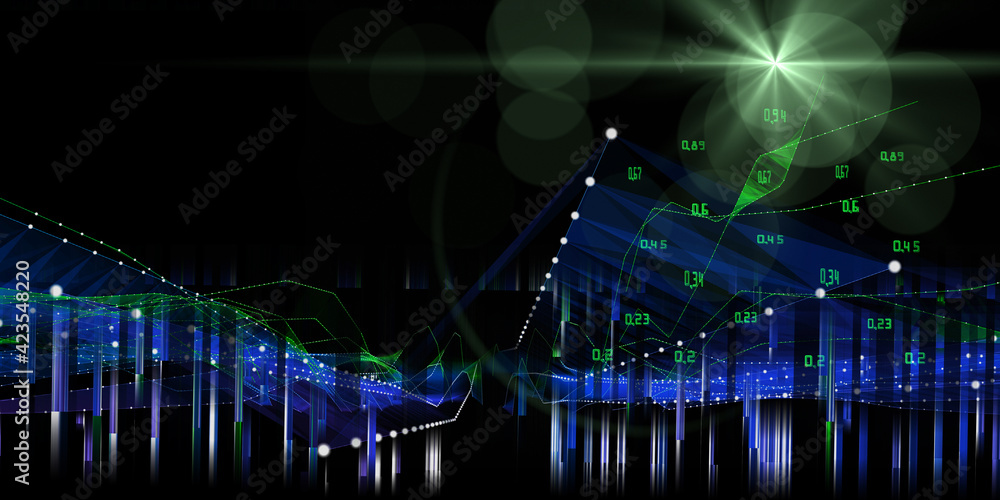 Abstract background techno with dots connecting in color grid and blurred lines on dark. Big Data. Visualization for business, science and technology. Futuristic technology banner with data.