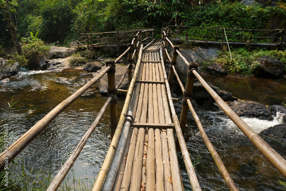Bamboo bridge across a creek in a natural forest trail.