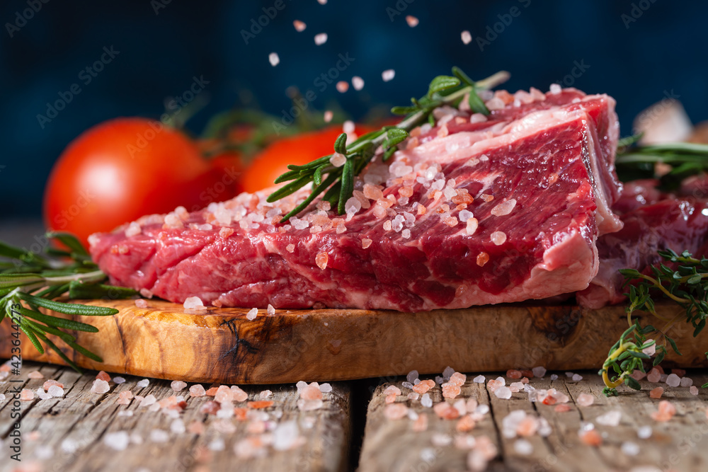 fresh steak with beef salted on a background of ingredients, frozen in motion on a blue background