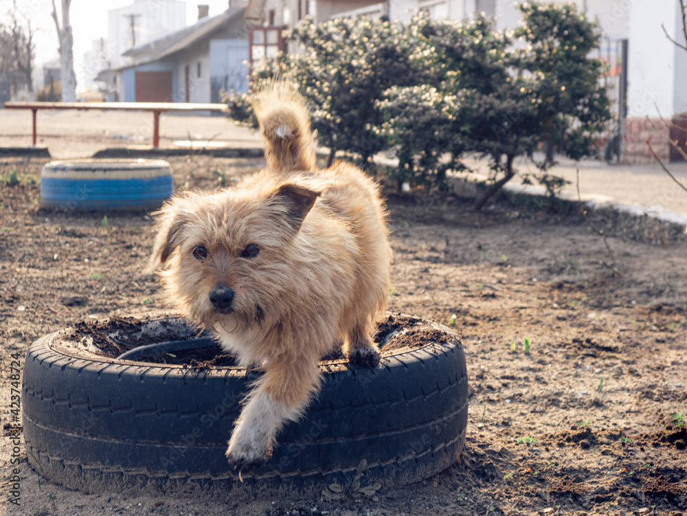 stray dog on a street near the train station, pets without owners