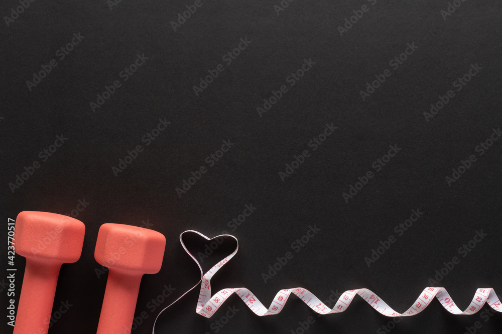 Dumbbells, measuring tape on black background. Fitness, sport, workout flatlay