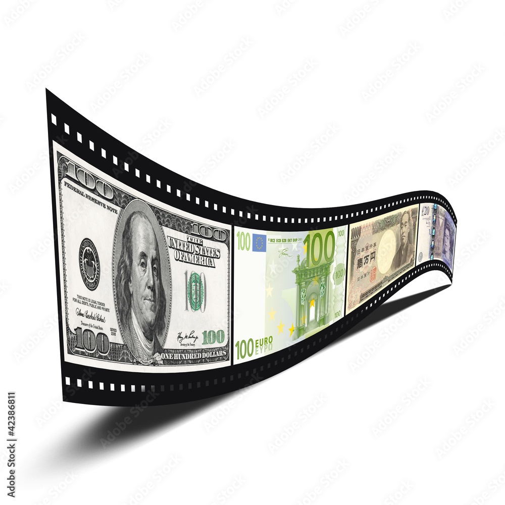 film strip with dollars, euro, yen, pound banknote pictures isol