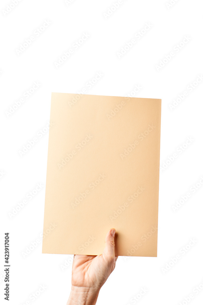Mockup of woman hand holding a colored cardboard on white background