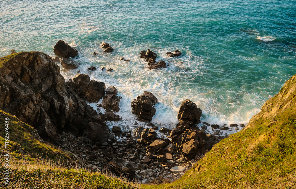 Handsome man eating healthy Mexican food tacos sitting at table at home in modern kitchen and smiling, looking away, copy space
