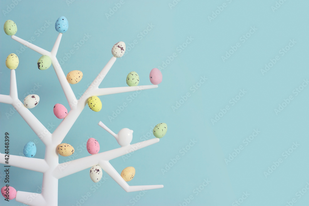Small decorative tree with colorful quail eggs on branches; Easter background with copy space