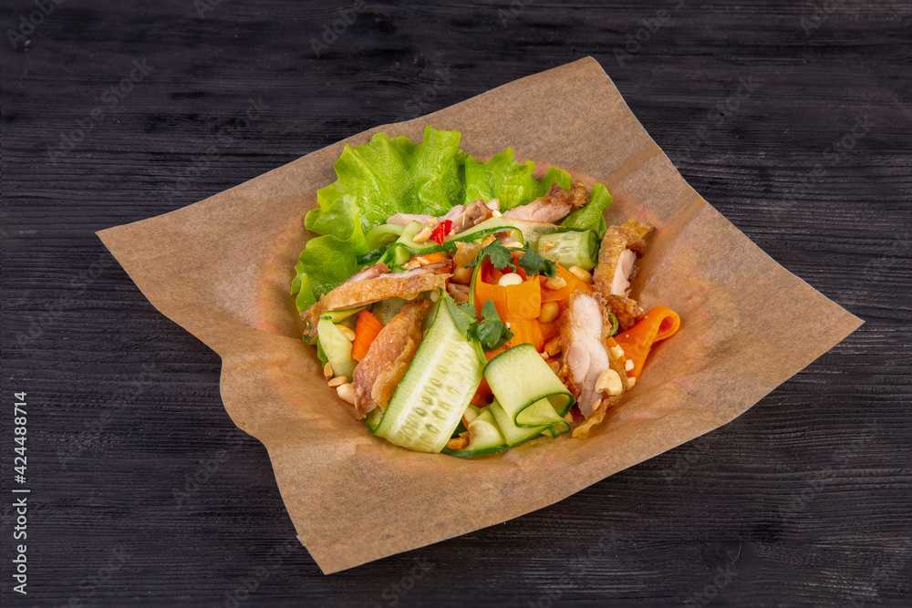 Salad with fresh vegetables, pieces of meat, lettuce leaves and greens