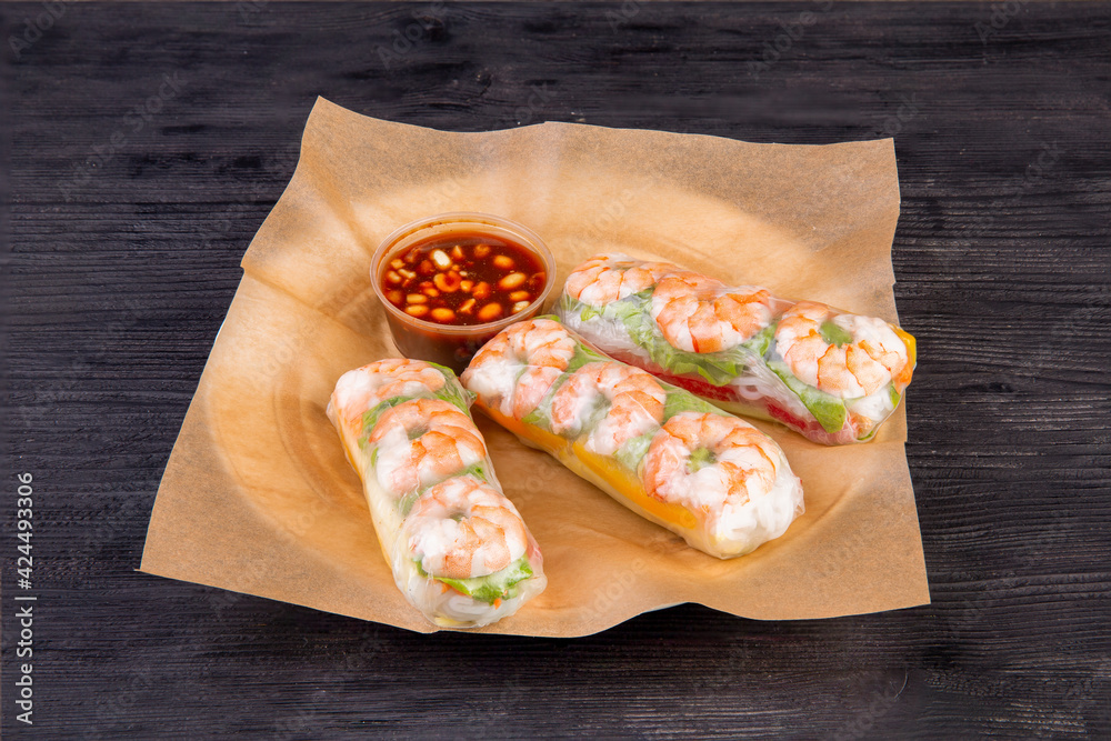 Rolls with boiled shrimp, vegetables and noodles, served with nut sauce