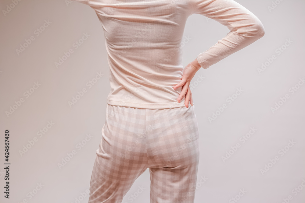 Beautiful sexy woman wearing a beige pajama. Fashion model on a beige background.