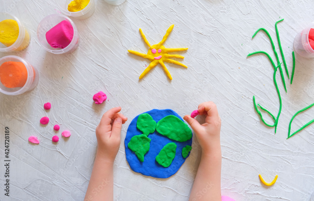 Child sculpturing plasticine planet for earth day. Protection of environment, Save our planet. Ecology concept. Concept of art learning and education, love earth , save world and unity.