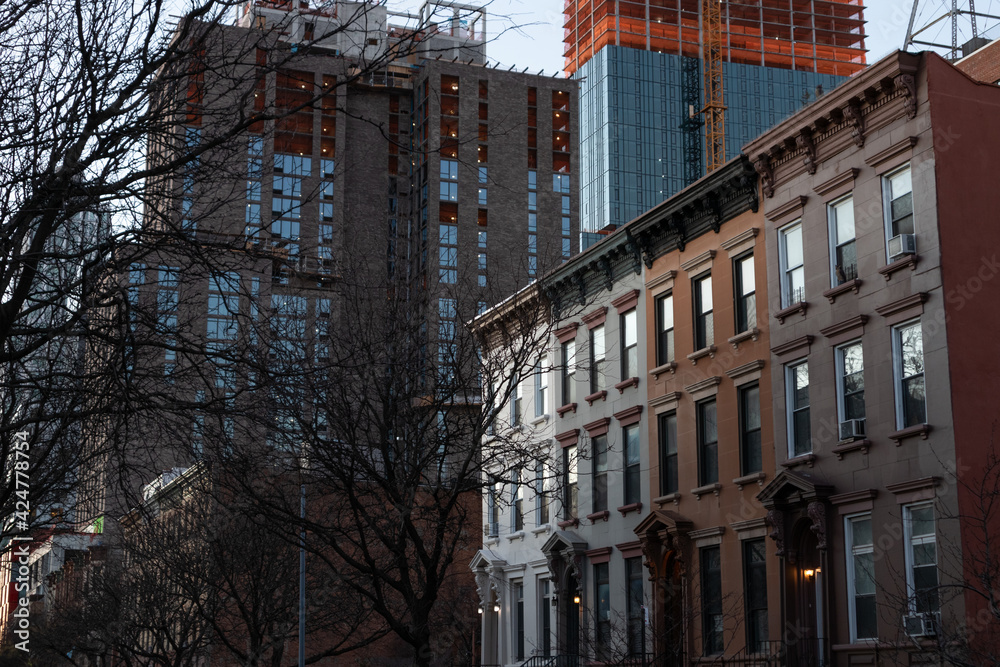 Row of Old Brownstone Homes with Modern Buildings and Construction in Prospect Heights of Brooklyn New York