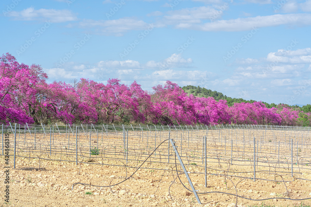 Cercis siliquastrum or Judas tree, next to a vineyard. Ornamental tree blooming with beautiful deep pink flowers in spring. Soft focus, blurred background.