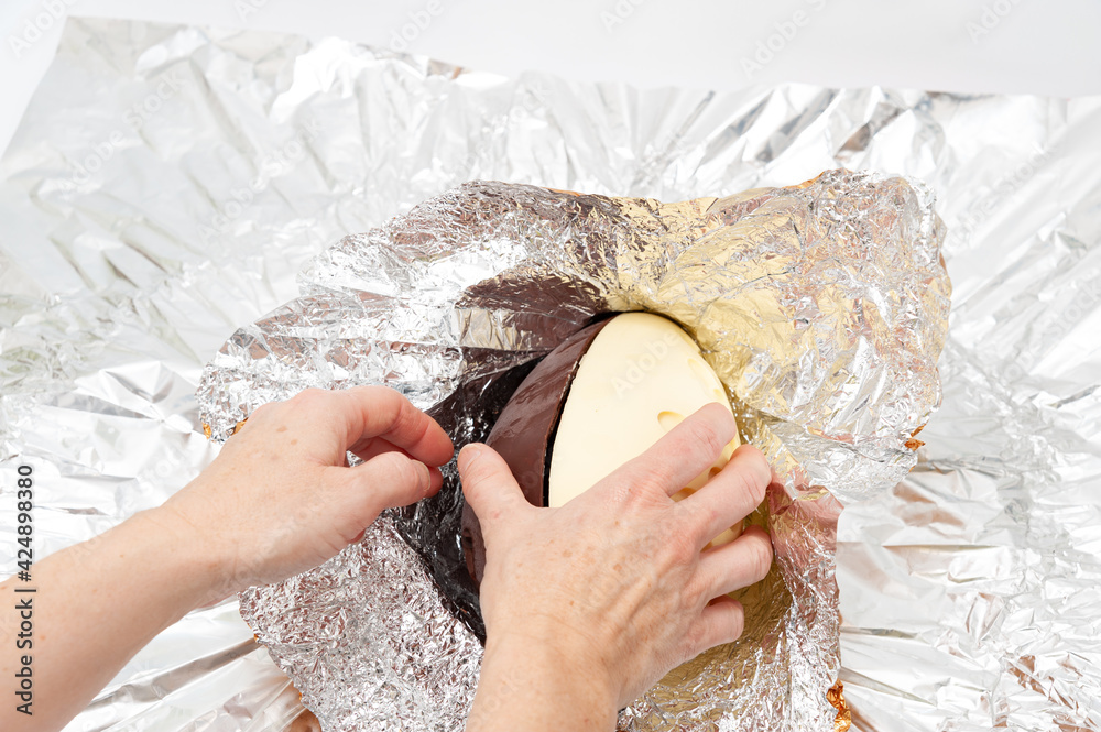 Easter Egg - Hands unpacking homemade chocolate egg wrapped in aluminum foil. Copy space