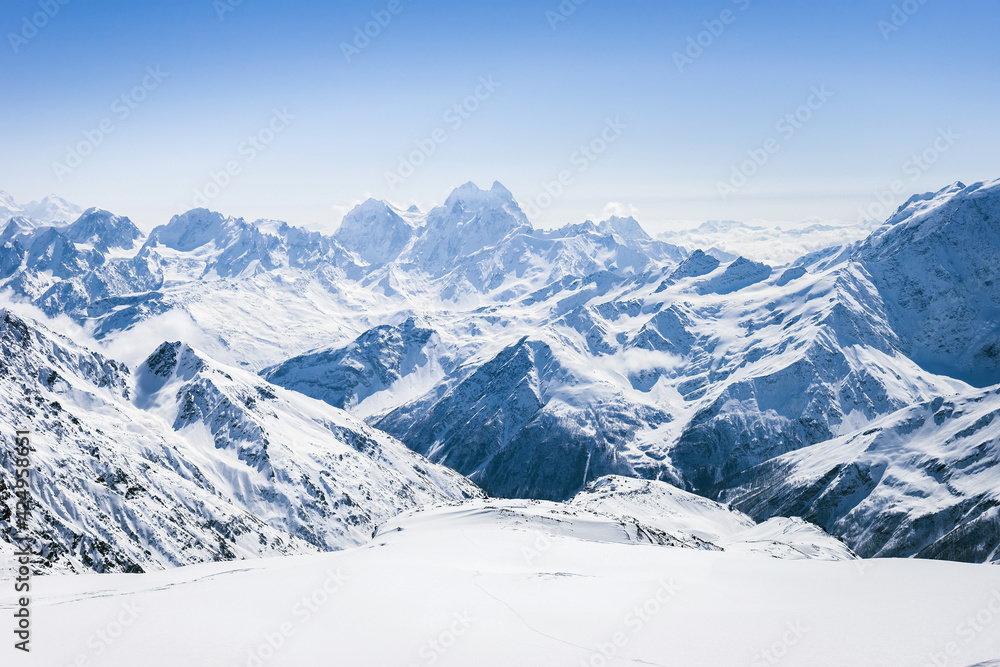 Snowy winter Greater Caucasus mountains at sunny day. View from ski slope Elbrus, Kabardino-Balkaria, Russia