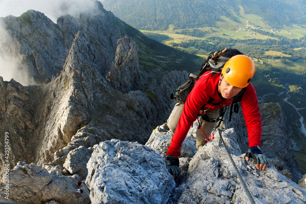 Climbing alpinist on Koenigsjodler route, Austria