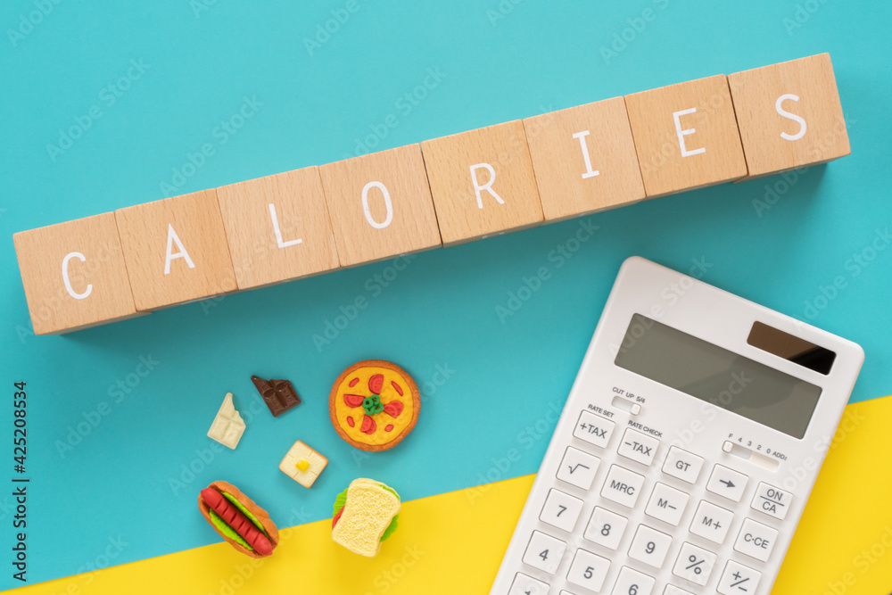 カロリー|「CALORIES」と書かれた積み木と食べ物のオブジェ