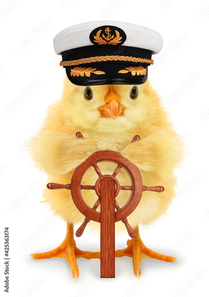 Cute cool chick ship captain with wooden rudder funny conceptual image