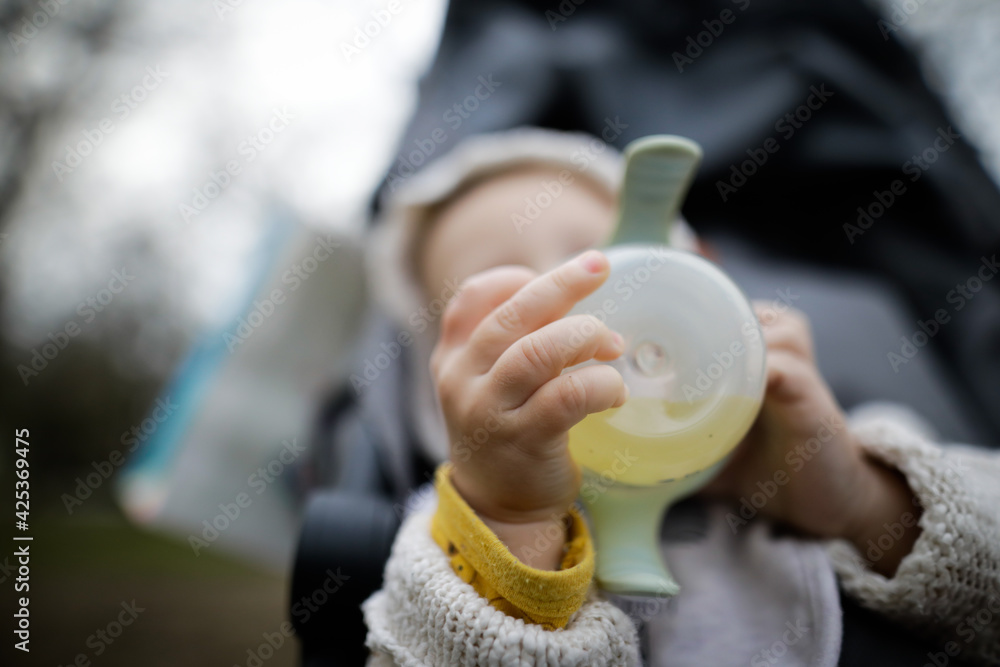 Shallow depth of field (selective focus) image with the hands of a baby boy holding a baby bottle.