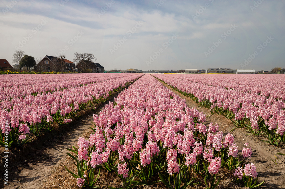 A bulb field full of pink flowering hyacinths in the bulb region in the Netherlands.