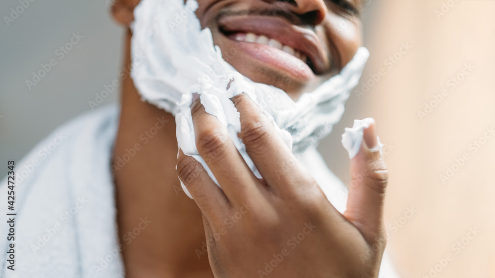 Male facial care. Skin treatment. Grooming routine. Happy confident African man applying white shaving foam on face with hand smiling isolated on light defocused background.