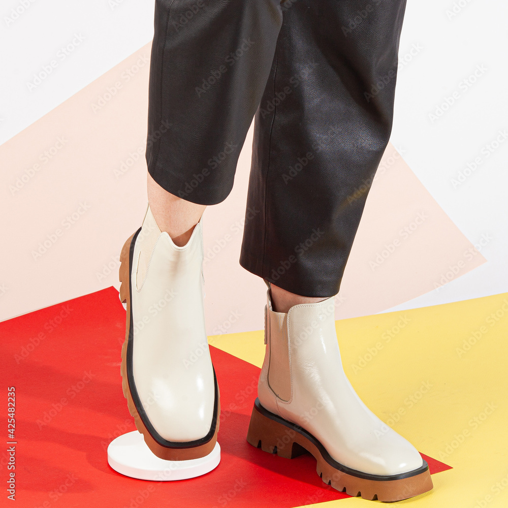 Women's legs in black pants and white short shoes on medium heel stands in the studio against a colored background