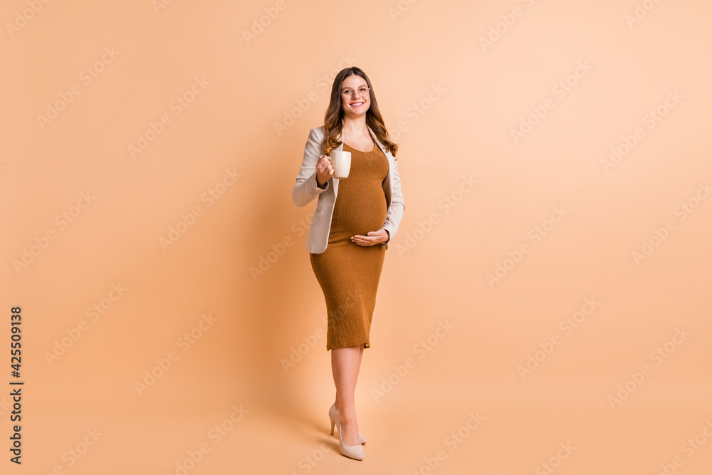 Full length body size view of lovely cheerful pregnant girl drinking green herbal tea pause break isolated over beige pastel color background