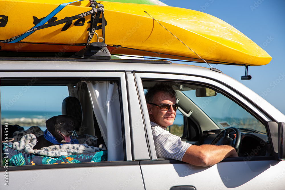 A male tourist pauses to take in the seaside view. He is driving a campervan with kayaks on the roof rack and his dog in the back.