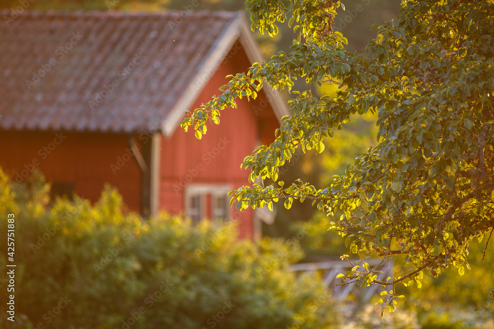 Classic Red summer garden cottage in Sweden. Traditional Sweden wooden old house in sunset light. Life on the one of Sweden islands