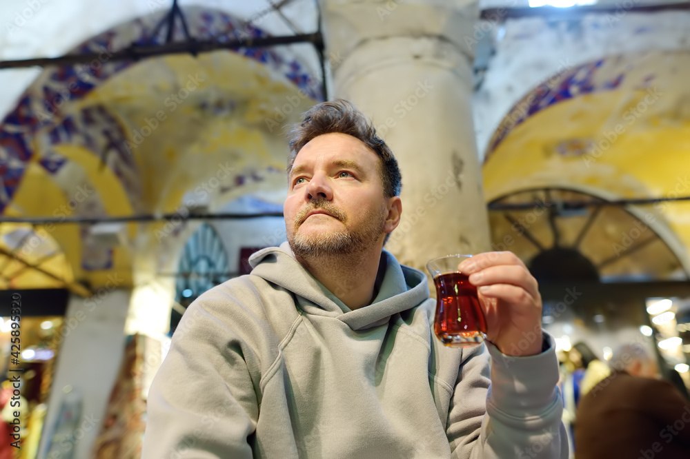 Mature man drink turkish tea sitting in small cafe in the Grand Bazaar in Istanbul, Turkey.