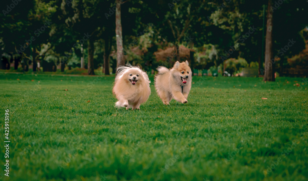 two pomeranian puppy dogs walking with tongue out in the park