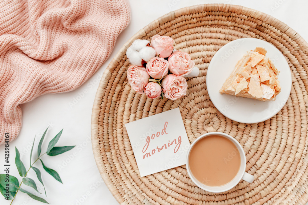 Wicker tray, cup of coffee, piece of cake, rose flowers, eucalyptus branch, pink knitted plaid or blanket, card with text GOOD MORNING. Breakfast in bed. Stylish home interior decor. Flat lay.