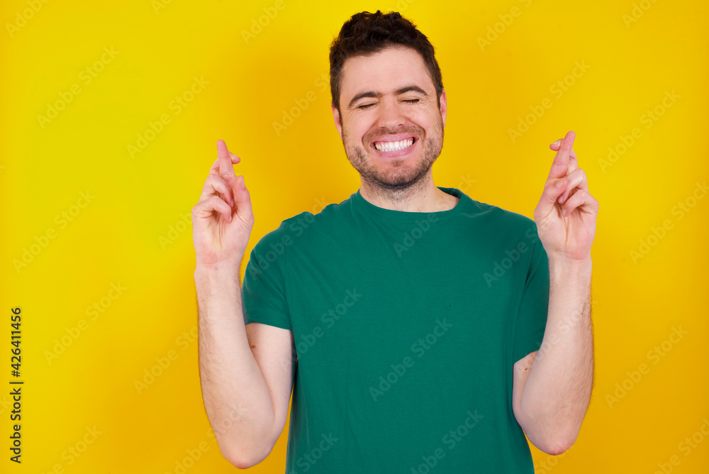 young Caucasian man wearing green T-shirt against yellow wall has big hope, crosses fingers, believes in good fortune, smiles broadly. People and wish concept