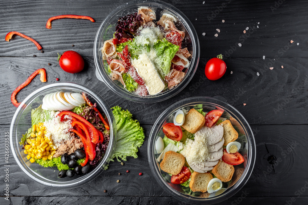 Set healthy light diet salad in plastic package for take away or food delivery. food in containers. place for text, top view
